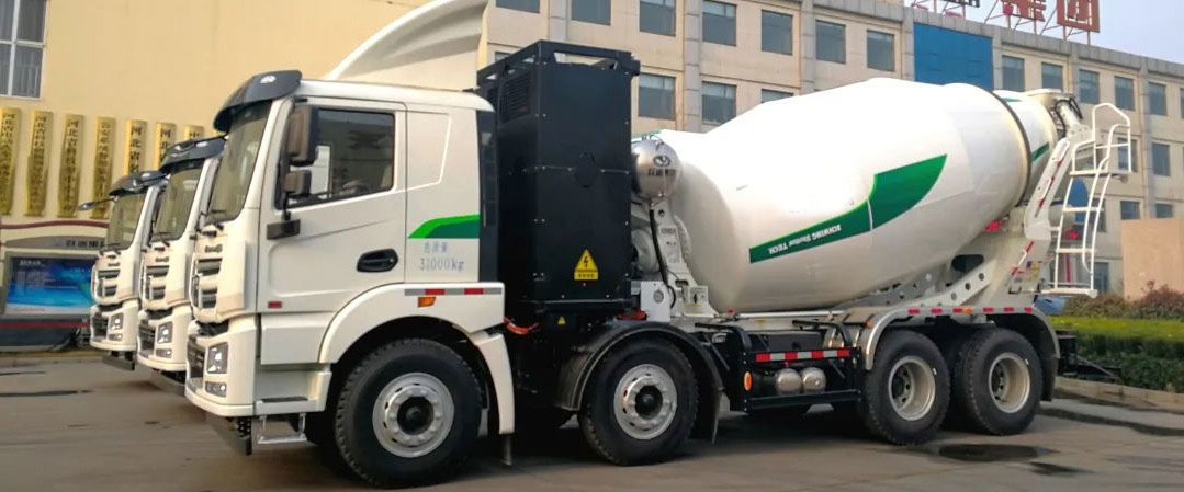 纯电动混凝土搅拌车整齐排列,为城市搅拌车市场量身定制,标准、低噪音、零排放、零污染,以环保为理念,全面满足各大城市混凝土运输需求。
